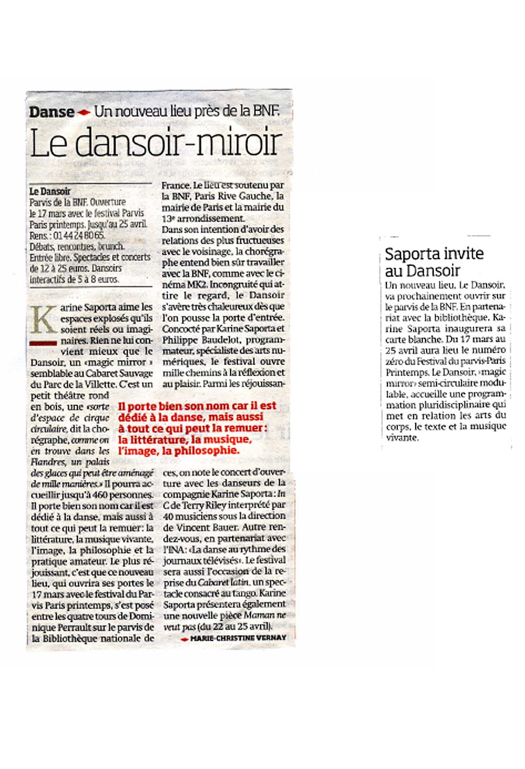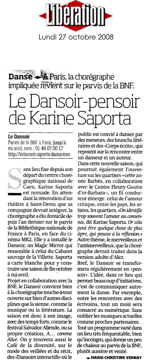 Le Dansoir – Pensoir de Karine Saporta – Libération 27-10-2008Le Dansoir Karine Saporta2019-08-02T13:11:00+02:00