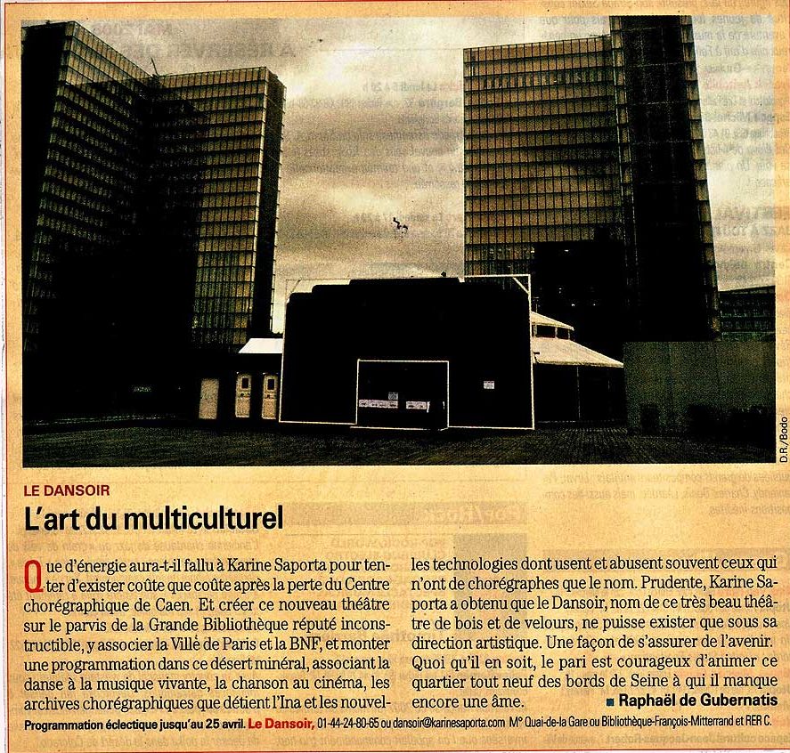 L’art du multiculturel – Le Dansoir – Nouvel Obs 30-10-2008Le Dansoir Karine Saporta2020-03-21T22:22:05+01:00