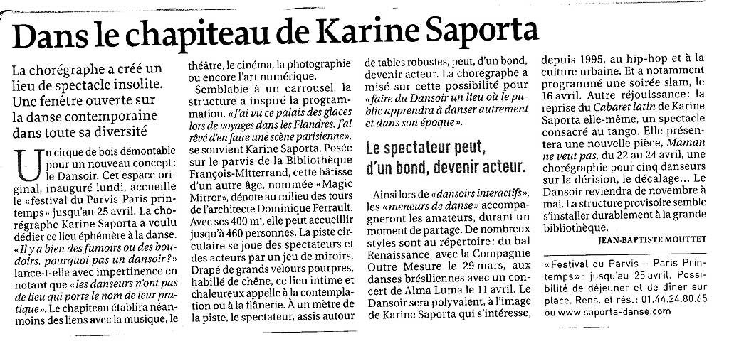 Dans le chapiteau de Karine Saporta – La Croix – 25/03/2008Le Dansoir Karine Saporta2020-03-21T22:41:59+01:00