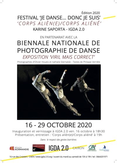 18h30 – IGDA 2.0 – Espace culturel / Galerie d’art contemporain – 16 Rue des Croisiers, Caen. Inauguration du Festival et vernissage de l’exposition « Viril mais correct » – Exposition en partenariat avec la Biennale nationale de photographie de danse, en présence de Karine Saporta et Pedro Pauwels, danseur et chorégraphe, fondateur de la Biennale. Exposition du 16 jusqu’au 29 octobre 2020, ouverture du mercredi au samedi de 15h00 à 19h00.