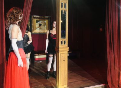 Dans une seconde partie , en référence au Musée d’Orsay et sur fond de peintures évocatrices de deux visions de la sexualité : l’une masculine (celle de Courbet avec sa célèbre « Origine du monde »), l’autre féminine (celle d’ORLAN avec sa plus récente « Origine de la guerre »), la chorégraphe interroge ensuite le statut du travestissement et de l’homosexualité à travers les siècles. Elle revisite avec délicatesse la théâtralité du cabaret, se référant à plusieurs moments au magnifique travail de la critique d’art Chantal Aubry sur « La femme et le travesti ».
