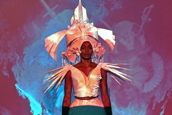 Lasers et costumes spectaculaires habillent la création de Karine Saporta dédiée aux rythmes créoles. Féerie et jeux de lumières sur des costumes en papier blanc.