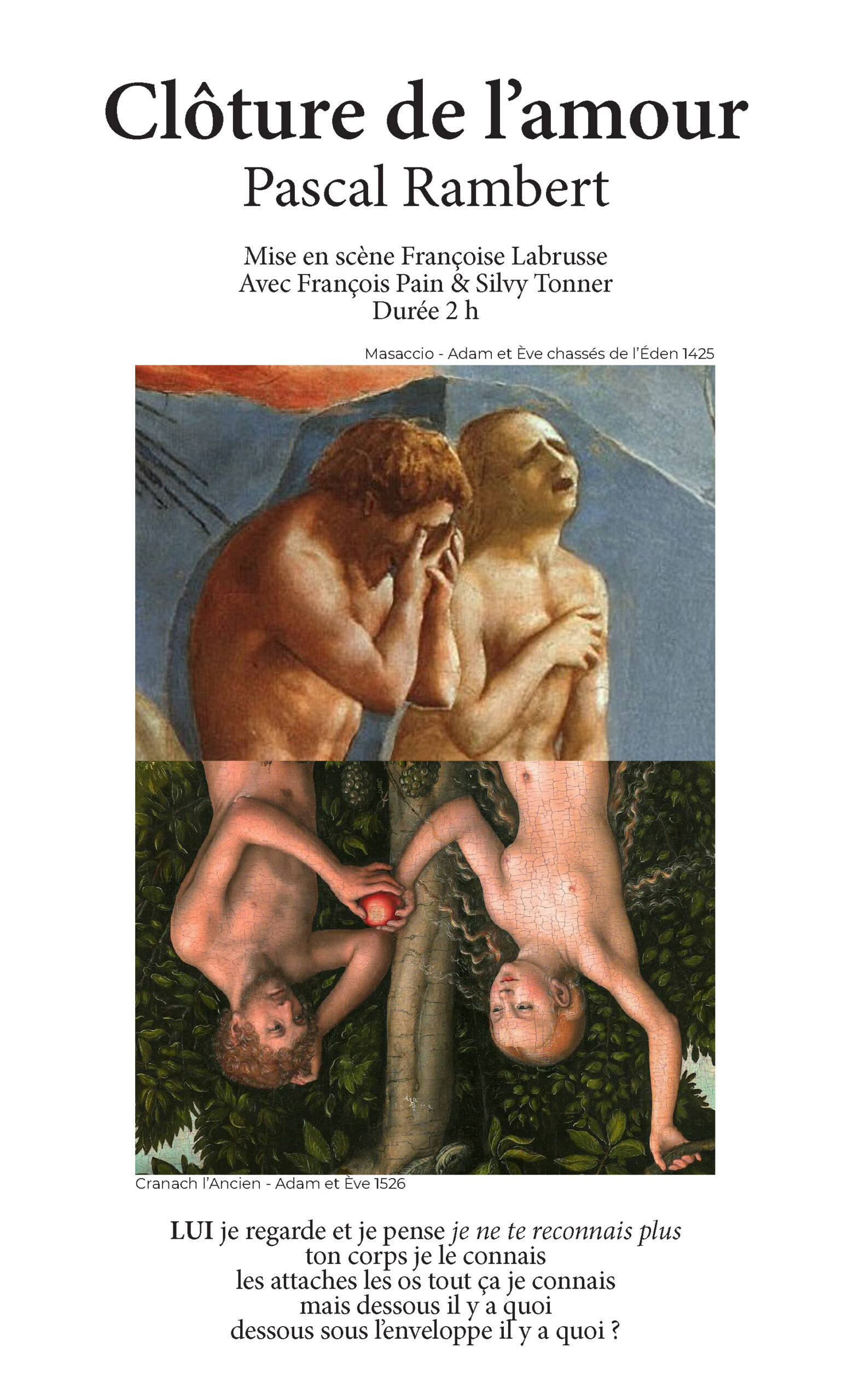 CLÔTURE DE L'AMOUR PASCAL RAMBERT PIÈCE DE THÉÂTRE Mise en scène Françoise Labrusse Avec François Pain & Silvy Tonner DIMANCHE 12 OCTOBRE 16H Durée : 2h Tarif unique : 10€ Moins de 15 ans ; […] |